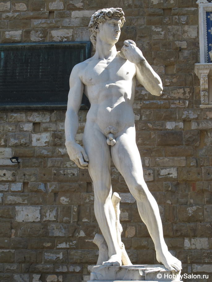 Композиция закрывает собой плоский камень в стене, на котором заметно изображение человеческого профиля. Откуда оно там взялось? Ответ находим в предании. Микеланджело якобы поспорил, что сможет, повернувшись спиной к изображению, высечь лик преступника, приговоренного к повешению на площади. Здесь же, на площади, можно увидеть конный памятник самому Козимо Медичи в исполнении Джамболонья, поставивший на мраморное основание бронзовые барельефы, увековечившие основные моменты жизни первого тосканского герцога.